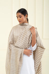 Louisette Taos Taupe Strips Ikat Reversible Zari Cashmere Shawl - Shawl / 212g*205cm*103cm